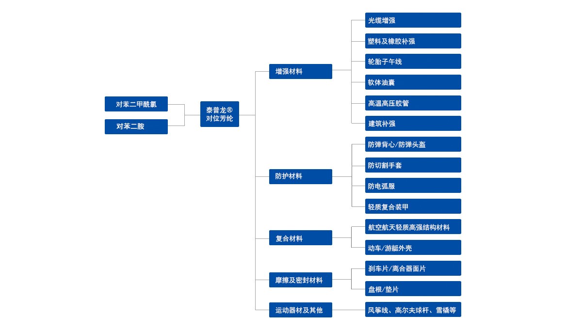 泰普龍®對位芳綸產品經過幾年來的市場推廣,已經得到越來越多國內外用戶的認可,開始在膠管骨架、增強基布、輪胎簾子布、盤根密封、光纜增強等領域得到應用,并逐步向其它高端應用領域延伸。